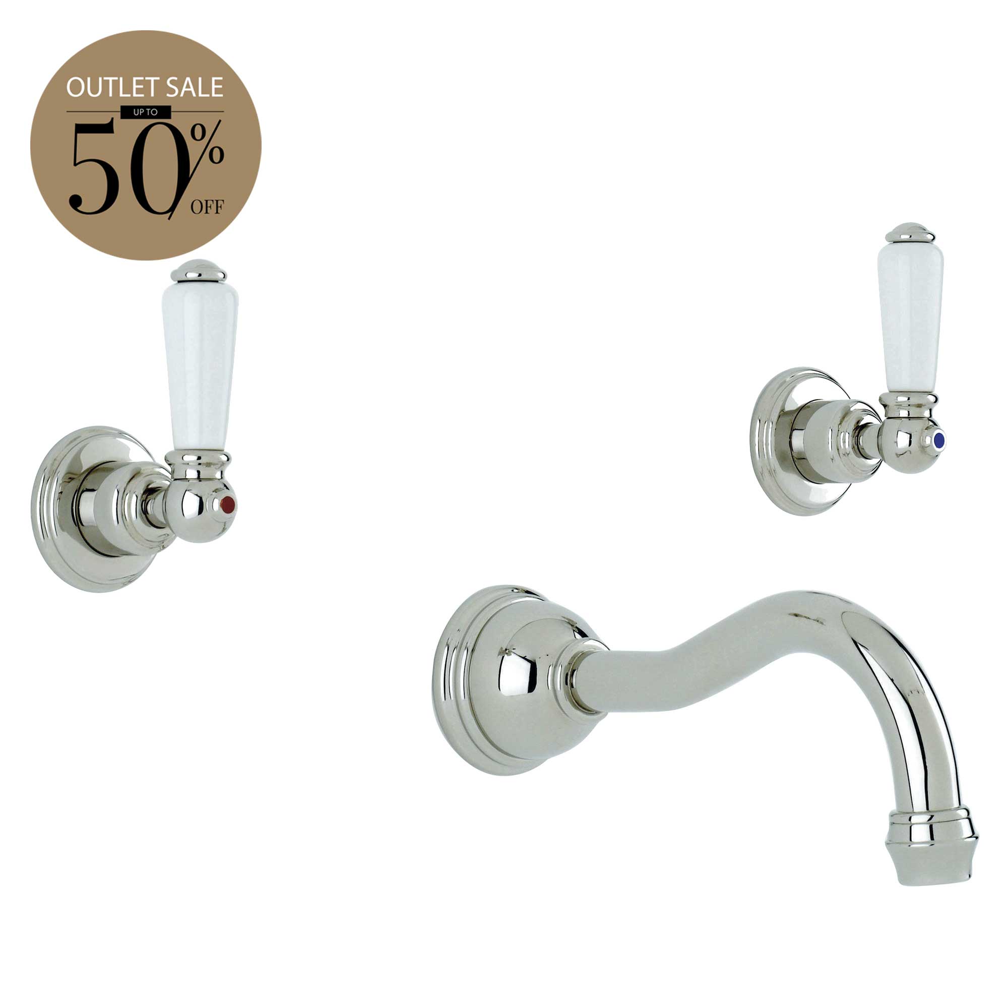 Perrin & Rowe 3790 Waschtisch 3-Loch Mischbatterie mit weissen Porzellangriffen, Auslauf COUNTRY, zur Wandmontage