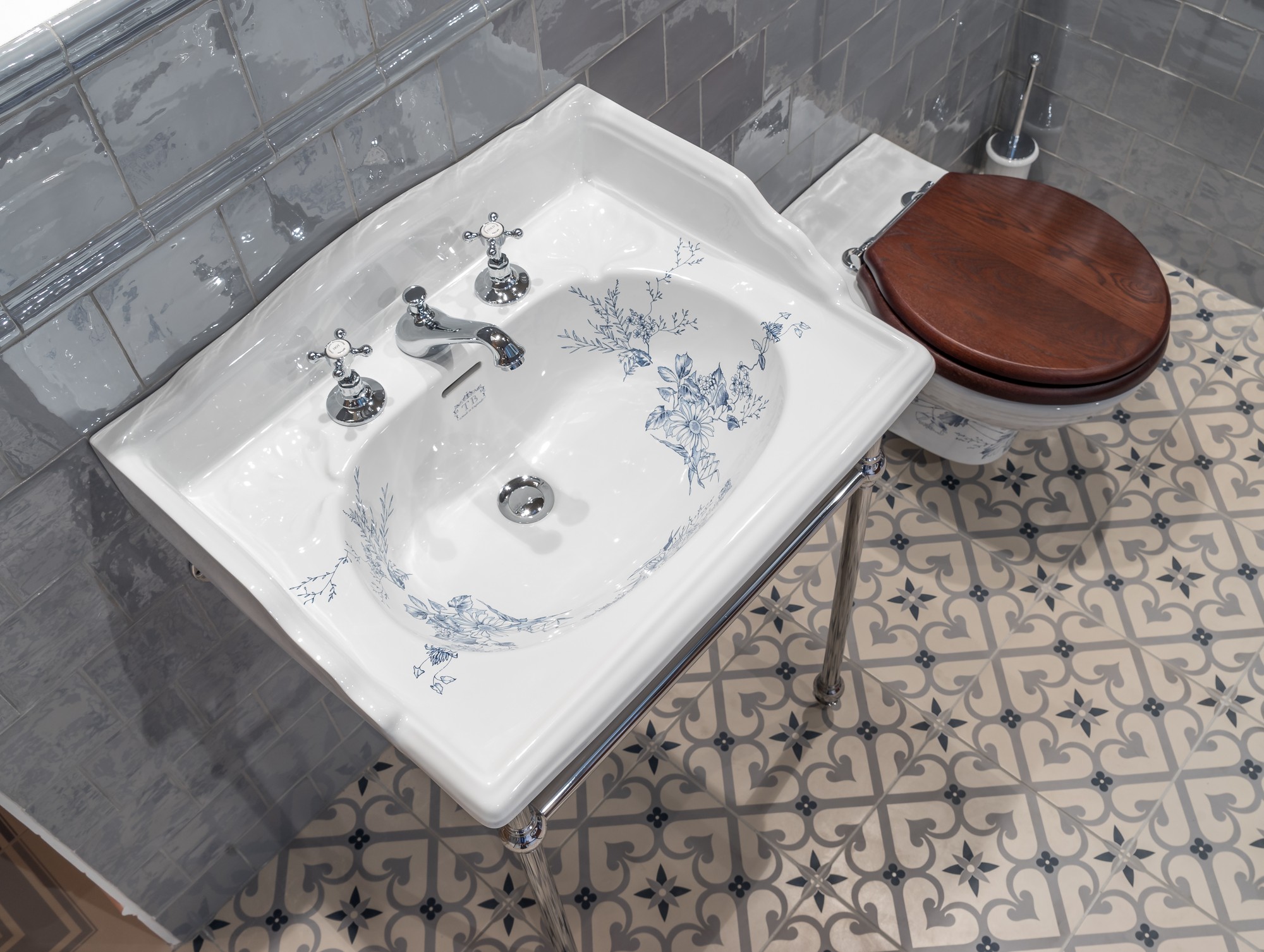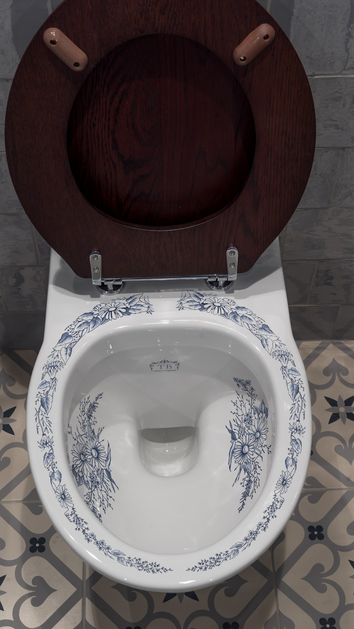 Wir haben die Vorzüge einer modernen, hängenden Toilette mit der klassischen Optik eines verzierten viktorianischen WC kombiniert und sind von dem Ergebnis absolut begeistert. Das wunderschöne blaue Blumenmotiv ziert die Toilette SOMERSET GARDEN sogar innen und aussen.